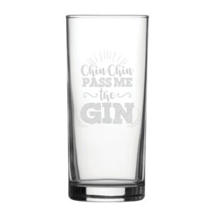 Pass the gin with our novelty gin glass! Featuring a “Chin Chin Pass Me The Gin” design, this charming glass makes for the perfect gift. Engraved on a traditional straight sided hiball tumbler, this drinking vessel holds 340ml. By being engraved, the novelty design will be everlasting and won’t wash away when cleaned with by hand or in the dishwasher. Partnered with a fantastic gift box, this glass makes the perfect gift for any event, such as birthdays, Christmas, Mother’s & Father’s Day, and retirements; ready to be gifted, this glass is eager to bring smiles and make for a memorable present.