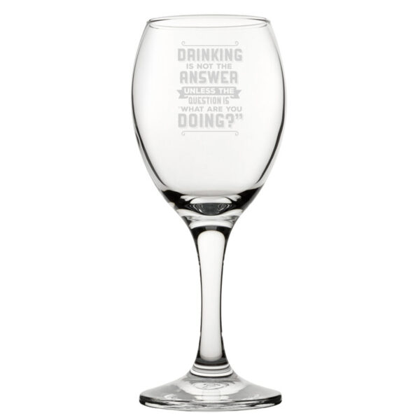 Show everyone what you’re up to with our novelty wine glass! Featuring a “Drinking Is Not The Answer, Unless The Question Is What Are You Doing?” design, this charming glass makes for the perfect gift. Engraved on a classically shaped, this drinking vessel holds 310ml. By being engraved, the novelty design will be everlasting and won’t wash away when cleaned with by hand or in the dishwasher. Partnered with a fantastic gift box, this glass makes the perfect gift for any event, such as birthdays, Christmas, Mother’s & Father’s Day, and retirements; ready to be gifted, this glass is eager to bring smiles and make for a memorable present.