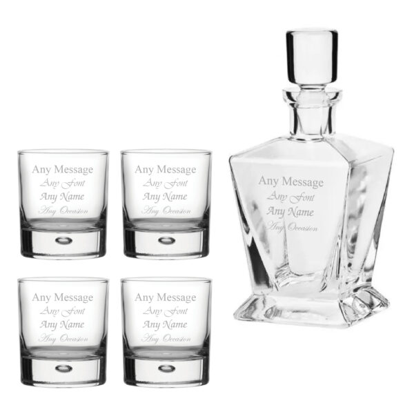 Make a perfect gift with this Personalised engraved 2x 11.5oz Bubble Whisky glass and 750ml Tapered Square Decanter set. With birthdays, anniversarys, retirements and many other reasons to celebrate, receiving this set is sure to bring a smile!