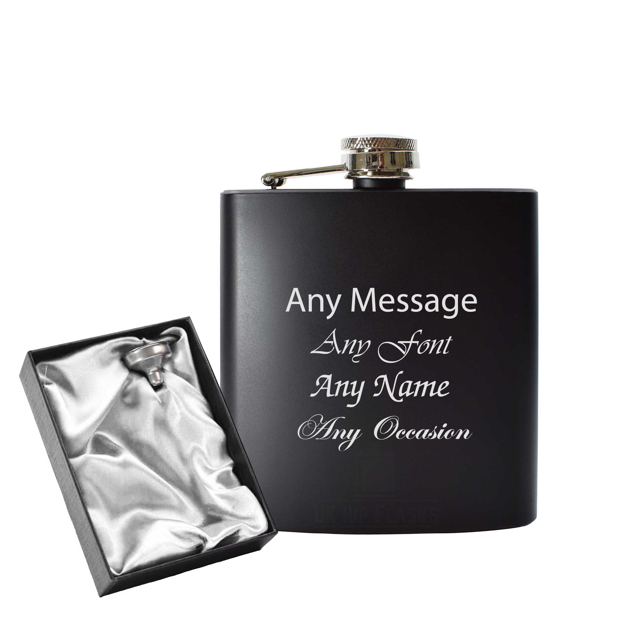 Have a warming drink on the go with this personalised Engraved 6oz matt black hip flask. Customise with any personal message. This hip flask comes in a gift box with Silver/white satin lining.
