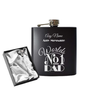 Have a warming drink on the go with this personalised Engraved 6oz matt black hip flask. Customise this No1 Dad design with any name and a short message. This hip flask comes in a gift box with Silver/white satin lining.