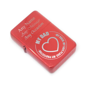 Make someones day special with this personalised engraved red painted lighter with My Dad – My Rock design. Being easy to use and very tactile, this lighter will be a bring pleasure with every strike. Made from steel with a pleasing painted finish. The lighter is a good size with rounded corners and a partly recessed hinge. Just fill with fuel and away you go.
