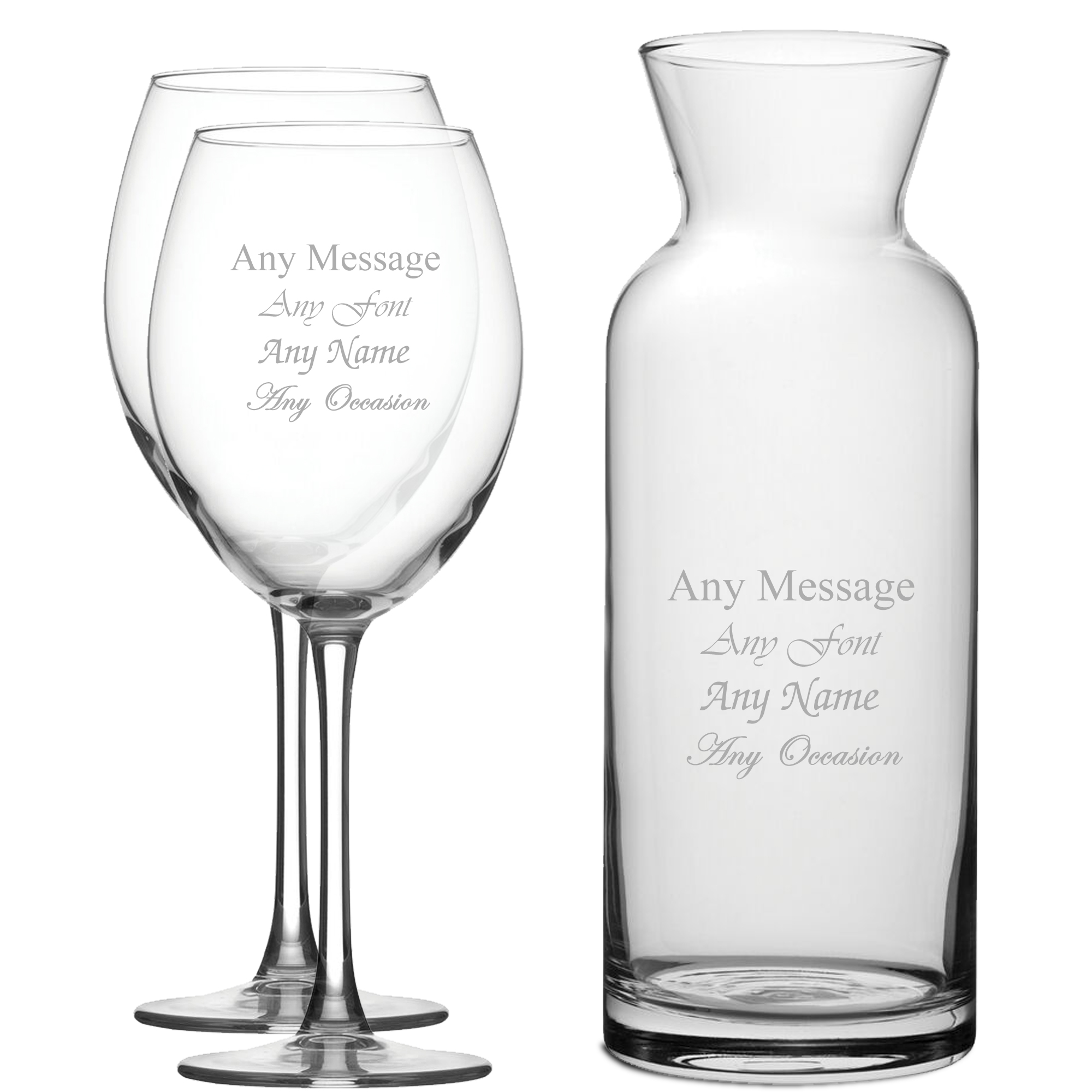 Personalise your wine glass and carafe set with any message for any occasion! The perfect present for any wine connoisseur, this is ideal for birthdays, Christmas, anniversaries, weddings and retirements. In addition with your personalisation, choose from any of our fonts to tailor your customisation to suit anyone and add an extra special touch to a remarkable gift. All accompanied with individual stunning gift boxes, you won’t need to worry about presentation. Etched with our laser engraving system, the featured design and your personalisation will be permanently etched into the glasses and carafe, ensuring your gift will be lasting and cherished for years to come. A traditional shape, the glasses in this set are stylish yet sophisticated, offering a generously large bowl upon a slender yet stable stem; a classic wine glass that’s ideal for red wine, yet also suitable for white and rose wine. The carafe in this set is versatile yet stylish, presenting straight sides that flow up to a flared rim – a charming carafe, perfect for any wine.
