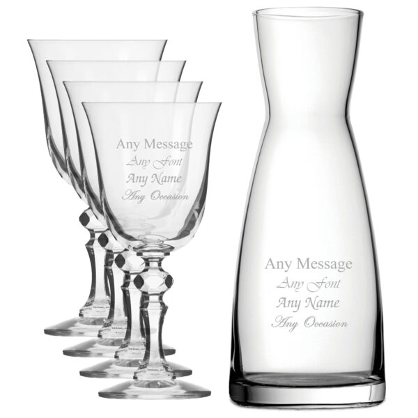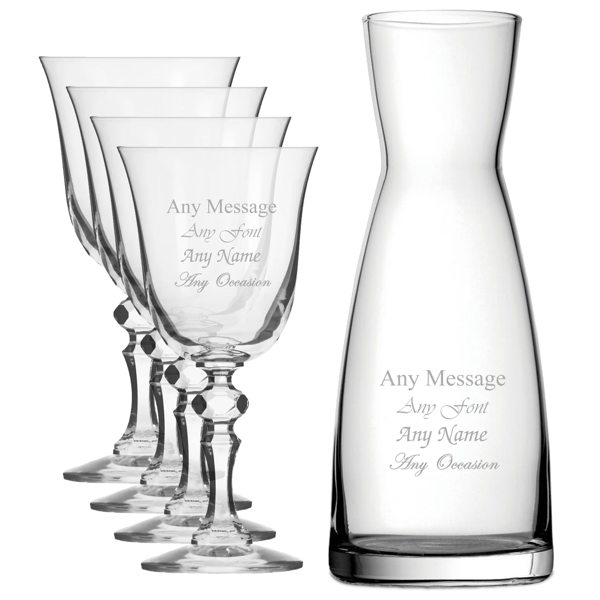 Personalise your wine glass and carafe set with any message for any occasion! The perfect present for any wine connoisseur, this is ideal for birthdays, Christmas, anniversaries, weddings and retirements. In addition with your personalisation, choose from any of our fonts to tailor your customisation to suit anyone and add an extra special touch to a remarkable gift. All accompanied with individual stunning gift boxes, you won’t need to worry about presentation. Etched with our laser engraving system, the featured design and your personalisation will be permanently etched into the glasses and carafe, ensuring your gift will be lasting and cherished for years to come. Made from lead-free crystal glass, the glasses in this set presents a vintage flared bowl upon a sturdy stem, including a featured crystal; the stem itself has a angular design cut-in, adding an extra notable detail to an already fabulous glass. The carafe in this set is tall and elegant; made from lead-free crystal glass, this carafe boasts a modern and sleek design, making for an attractive addition to any tabletop.