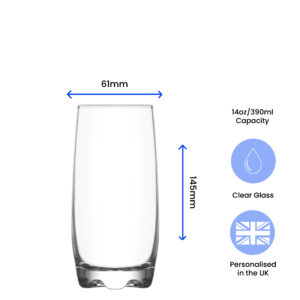 Give the perfect gift for any vodka fanatic with our personalised engraved ‘Name’s Vodka Glass and Mixer’ hiball tumbler! This glass showcases a novelty, funny design which displays your personalised name, along with the preferred mixer, mixer percentage and vodka percentage – simply add any name to produce a one-of-a-kind present! This makes for a great gift for any occasion, such as your sister’s birthday, a secret Santa present for a colleague or a surprise goodie for your best friend. Measuring 145mm high and 60mm wide, and holding 390ml/13oz, this glass features a slightly tapered silhouette and a bell pepper bottom, adding a stylish touch to your drinking experience. Elevate your table setting with this uniquely designed glass. Our laser engraving system ensures that your personalisation and design are permanently etched onto the glass to craft a lasting, sentimental present that will be treasured for years to come. To enhance the gifting experience, your personalised glass will arrive in a stunning blue and gold decorative gift box, making it ready to present directly to the lucky recipient.