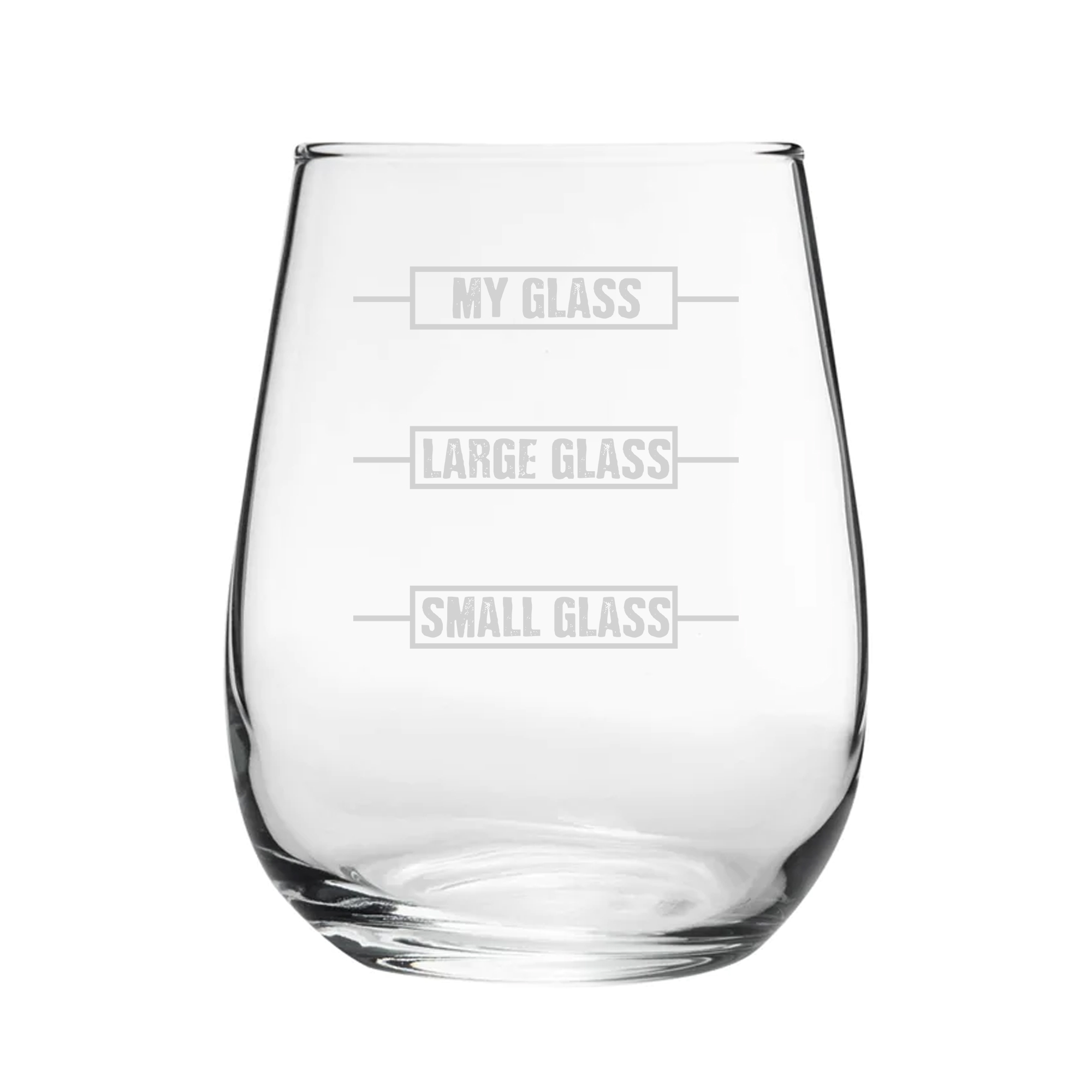 Show where your glass should be filled to with our novelty wine glass! Featuring a “Small Glass, Large Glass, My Glass” design, this charming glass makes for the perfect gift. Engraved on a contemporary stemless goblet, this drinking vessel holds 360ml. By being engraved, the novelty design will be everlasting and won’t wash away when cleaned with by hand or in the dishwasher. Partnered with a fantastic gift box, this glass makes the perfect gift for any event, such as birthdays, Christmas, Mother’s Day and retirements; ready to be gifted, this glass is eager to bring smiles and make for a memorable present.