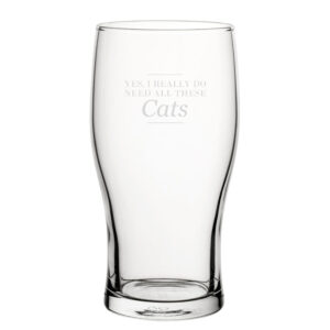 Gift the cat lover you know their own novelty beer glass! Featuring a Yes, I Really Do Need All These Cats design, this makes for a great gift for any cat lover. Engraved on a traditional tulip-shaped beer glass, this drinking vessel holds a full pint (20oz). By being engraved, the novelty design will be everlasting and won’t wash away when cleaned with by hand or in the dishwasher. Partnered with a fantastic gift box, this glass makes the perfect gift for any event, such as birthdays, Christmas, Mother’s & Father’s Day, and retirements; ready to be gifted, this glass is eager to bring smiles and make for a memorable present.